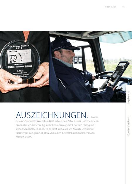 AUSZEICHNUNGEN. Umsatz, Gewinn, Standorte: Wachstum lässt sich an den Zahlen einer Unternehmensbilanz ablesen. Gleichzeitig sucht Knorr-Bremse nicht nur den Dialog mit seinen Stakeholdern, sondern bewirbt sich auch um Awards. Denn KnorrBremse will sich gerne objektiv von außen bewerten und an Benchmarks messen lassen. 9 5ÜB E R B L I C K La ge be ric ht Ko nz er na bs ch lu ss | |