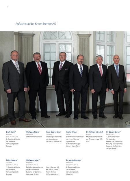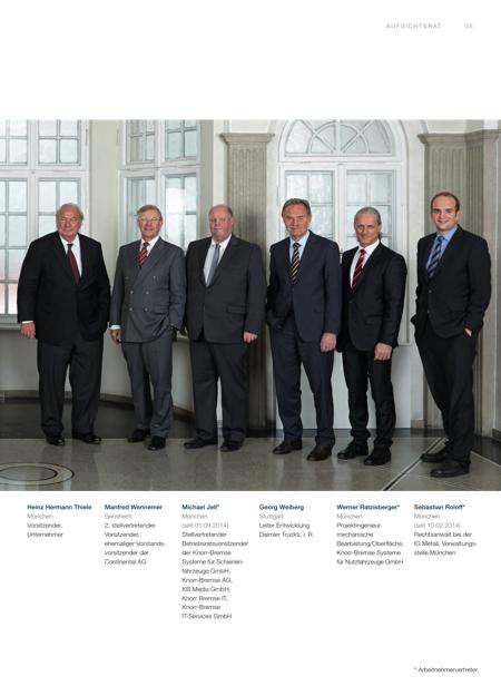 0 5A U F S I C H T S R AT * Arbeitnehmervertreter. Heinz Hermann Thiele München Vorsitzender, Unternehmer Manfred Wennemer Bensheim 2. stellvertretender Vorsitzender, ehemaliger Vorstands vorsitzender der Continental AG Michael Jell* München (seit 01.09.2014) Stellvertretender Betriebsratsvorsitzender der Knorr-Bremse Systeme für Schienenfahrzeuge GmbH, Knorr-Bremse AG, KB Media GmbH, Knorr Bremse IT, Knorr-Bremse IT-Services GmbH Georg Weiberg Stuttgart Leiter Entwicklung Daimler Trucks, i. R. Werner Ratzis berger* München Projektingenieur mechanische Bearbeitung/Oberfläche, Knorr-Bremse Systeme für Nutzfahrzeuge GmbH Sebastian Roloff* München (seit 10.02.2014) Rechtsanwalt bei der IG Metall, Verwaltungsstelle München | |