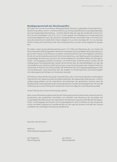 1 4 3B E S TÄT I G U N G S V E R M E R K Bestätigungsvermerk des Abschlussprüfers Wir haben den von der Knorr-Bremse Aktiengesellschaft, München, aufgestellten Konzernabschluss – bestehend aus Bilanz, Gewinnund Verlust-Rechnung, Anhang, Kapitalflussrechnung, Eigenkapitalspiegel sowie Segmentberichterstattung – und ihren Bericht über die Lage der Gesellschaft und des Konzerns für das Geschäftsjahr vom 01.01. bis 31.12.2014 geprüft. Die Aufstellung von Konzernabschluss und Konzernlagebericht nach den deutschen handelsrechtlichen Vorschriften liegt in der Verantwortung des Vorstands der Gesellschaft. Unsere Aufgabe ist es, auf der Grundlage der von uns durchgeführten Prüfung eine Beurteilung über den Konzernabschluss und den Konzernlagebericht abzugeben. Wir haben unsere Konzernabschlussprüfung nach § 317 HGB unter Beachtung der vom Institut der Wirtschaftsprüfer (IDW) festgestellten deutschen Grundsätze ordnungsmäßiger Abschlussprüfung vorgenommen. Danach ist die Prüfung so zu planen und durchzuführen, dass Unrichtigkeiten und Verstöße, die sich auf die Darstellung des durch den Konzernabschluss unter Beachtung der Grundsätze ordnungsmäßiger Buchführung und durch den Konzernlagebericht vermittelten Bildes der Vermögens-, Finanzund Ertragslage wesentlich auswirken, mit hinreichender Sicherheit erkannt werden. Bei der Festlegung der Prüfungshandlungen werden die Kenntnisse über die Geschäftstätigkeit und über das wirtschaftliche und rechtliche Umfeld des Konzerns sowie die Erwartungen über mögliche Fehler berücksichtigt. Im Rahmen der Prüfung werden die Wirksamkeit des rechnungslegungsbezogenen internen Kontrollsystems sowie Nachweise über die Angaben im Konzernabschluss und Konzernlagebericht überwiegend auf der Basis von Stichproben beurteilt. Die Prüfung umfasst die Beurteilung der Jahresabschlüsse der in den Konzernabschluss einbezogenen Unternehmen, der Abgrenzung des Konsolidierungskreises, der angewandten Bilanzierungsund Konsolidierungsgrundsätze und der wesentlichen Einschätzungen der gesetzlichen Vertreter sowie die Würdigung der Gesamtdarstellung des Konzernabschlusses und des Konzernlageberichts. Wir sind der Auffassung, dass unsere Prüfung eine hinreichend sichere Grundlage für unsere Beurteilung bildet. Unsere Prüfung hat zu keinen Einwendungen geführt. Nach unserer Beurteilung aufgrund der bei der Prüfung gewonnenen Erkenntnisse entspricht der Konzernabschluss den gesetzlichen Vorschriften und vermittelt unter Beachtung der Grundsätze ordnungsmäßiger Buchführung ein den tatsächlichen Verhältnissen entsprechendes Bild der Vermögens-, Finanzund Ertragslage des Konzerns. Der Konzernlagebericht steht in Einklang mit dem Konzernabschluss, vermittelt insgesamt ein zutreffendes Bild von der Lage des Konzerns und stellt die Chancen und Risiken der zukünftigen Entwicklung zutreffend dar. München, den 02.03.2015 KPMG AG Wirtschaftsprüfungsgesellschaft gez. Rupprecht, Wirtschaftsprüfer gez. Münch, Wirtschaftsprüfer | |