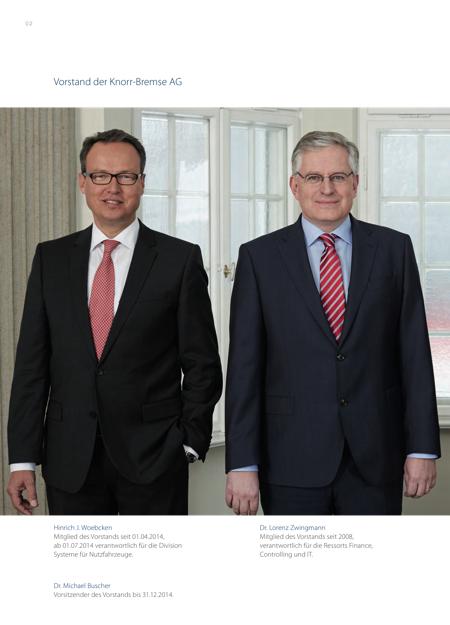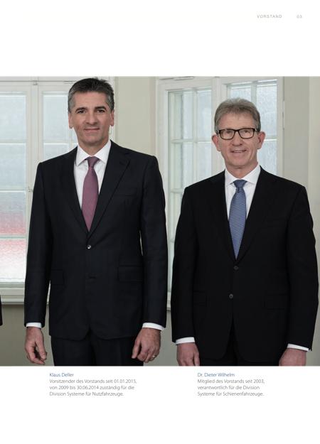 0 3R E POR TV O S TA N D Dr. Dieter Wilhelm Mitglied des Vorstands seit 2003, verantwortlich für die Division Systeme für Schienenfahrzeuge. Klaus Deller Vorsitzender des Vorstands seit 01.01.2015, von 2009 bis 30.06.2014 zuständig für die Division Systeme für Nutzfahrzeuge. | |